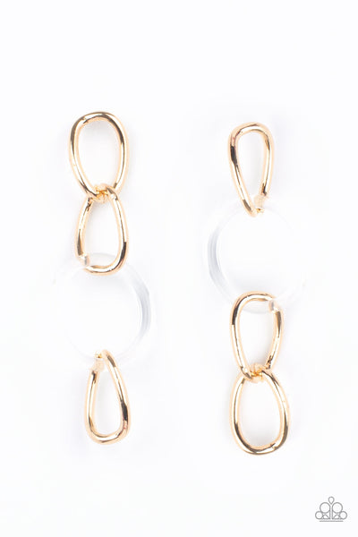 Bright gold oversized links, interrupted by a single large clear acrylic ring, fall from the ear in linked succession for an on-trend fashion statement. Earring attaches to a standard post fitting.