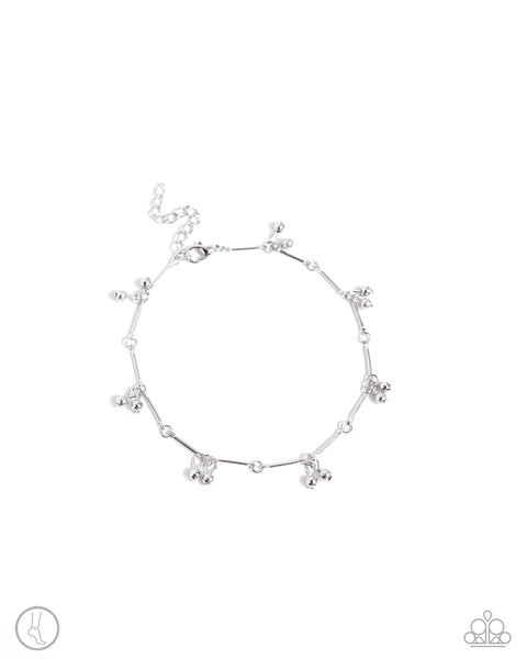 A duo of silver beads attached to silver jump rings and silver rings alternate with dainty bowing silver bars for a monochromatic opulence around the ankle. Features an adjustable clasp closure.