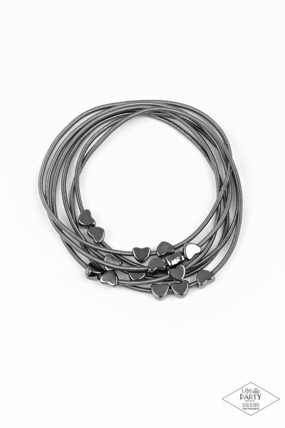 Dainty gunmetal hearts slide along interlocking stretchy spring-like wires, creating whimsical layers across the wrist.