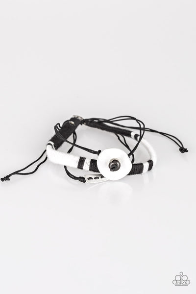 Featuring wooden and hammered metallic accents, strands of black cording join a black and white threaded band around the wrist for a seasonal look. Features an adjustable sliding knot closure.