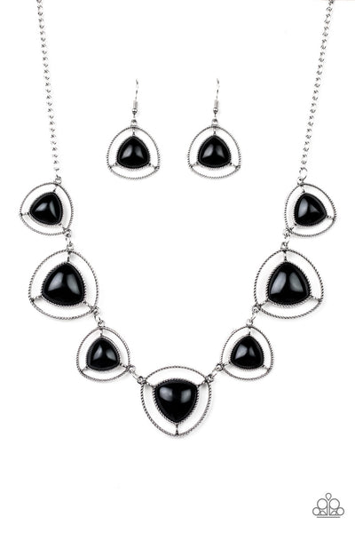Varying in size, pyramidal black beads are encased in airy silver frames and linked below the collar for a trendsetting look. Features an adjustable clasp closure.