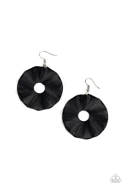 Shiny black crepe-like paper is wrapped around a rippling round disc, creating a modern display. Earring attaches to a standard fishhook fitting.