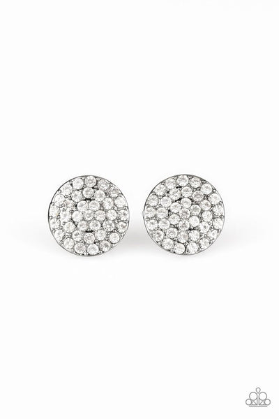 Countless white rhinestones are encrusted across the front of a beveled gunmetal frame for a show-stopping look. Earring attaches to a standard post fitting.