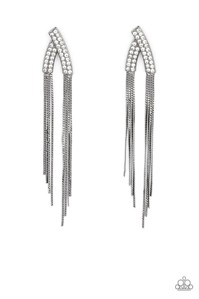 Encrusted in double rows of glassy white rhinestones, two glistening gunmetal frames overlap into a v-shaped frame. Flat gunmetal chains stream from the bottom of the glittery frame, creating an edgy tassel. Earring attaches to a standard post fitting.