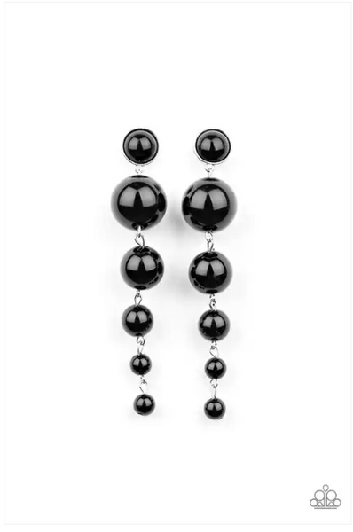 Attached to a matching black beaded silver fitting, a bubbly collection of polished black beads graduate in size as they trickle from the ear, linking into a dramatically elegant lure. Earring attaches to a standard post fitting.