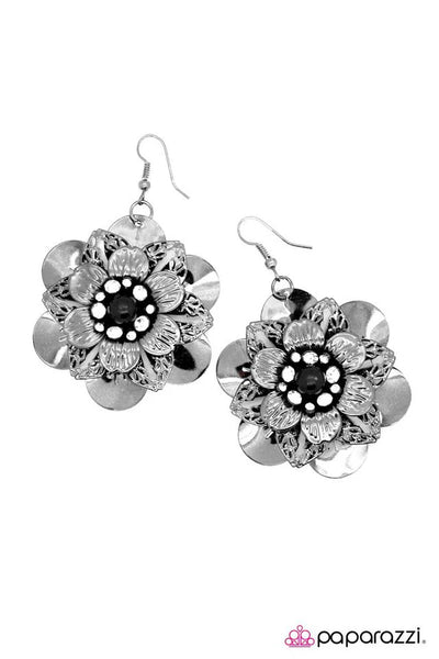 Sleek gunmetal petals with a variety of textures are layered to create a dramatic flower. A single black bead bordered by a ring of rhinestones anchors the design while adding unmatched sparkle.