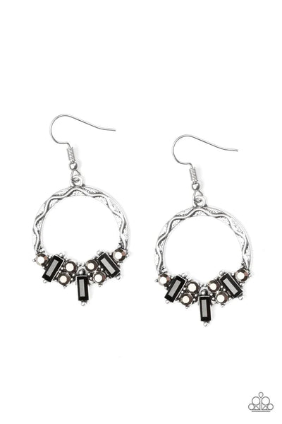 Featuring round and emerald style cuts, radiant hematite and black rhinestones are encrusted along the bottom of an ornate silver hoop for an edgy look. Earring attaches to a standard fishhook fitting.
