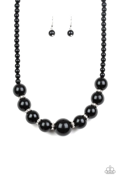 Threaded along an invisible wire, classic black beads give way to an alternating collection of oversized black beads and white rhinestone encrusted rings below the collar for a timeless sparkle. Features an adjustable clasp closure. Sold as one individual necklace. Includes one pair of matching earrings.