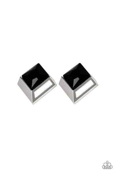 Featuring a refined square-cut, a faceted black rhinestone is pressed into a 3-dimensional silver frame for an edgy look. Earring attaches to a standard post fitting.