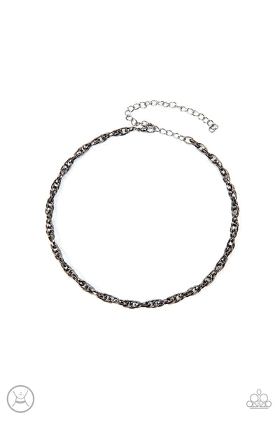 An ornately linked gunmetal chain wraps around the neck, resulting in an edgy minimalist inspired grit. Features an adjustable clasp closure.