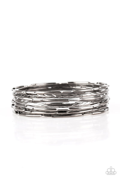 Featuring smooth, serrated, and pinched finishes, mismatched gunmetal bangles stack across the wrist for a bold industrial look.