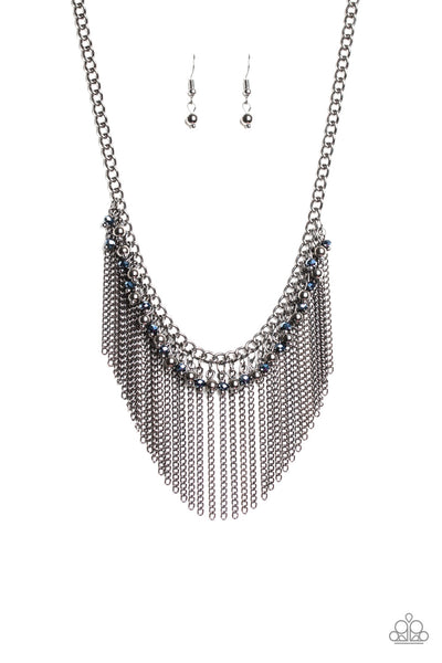 A glistening fringe of shiny gunmetal beads, metallic blue crystal-like beads, and glistening gunmetal chains dangle from the bottom of a classic gunmetal chain, creating an edgy-glamorous fringe below the collar. Features an adjustable clasp closure.