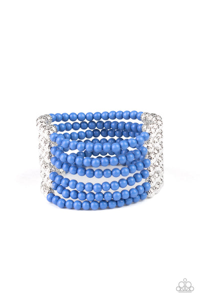 Held together with silver fittings, row after row of ornate silver and polished blue beads are threaded along stretchy bands around the wrist of a colorful fashion.