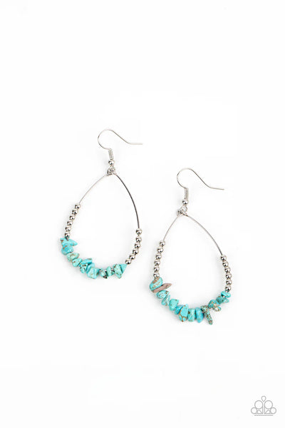 Dainty silver beads flank a row of refreshing turquoise rock beads along a dainty silver wire, creating an earthy teardrop frame. Earring attaches to a standard fishhook fitting.