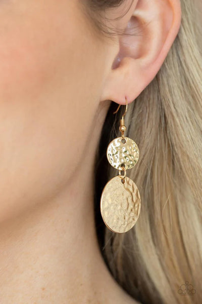 An earthy collection of hammered gold discs, turquoise stone accents, and bold gold hoops link with sections of chunky and mismatched gold chains across the chest, creating a seasonal display. Features an adjustable clasp closure.