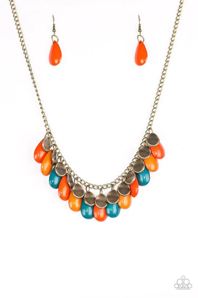 Polished blue, orange, and red teardrops drip from the bottom of a shimmery brass chain, creating a colorful fringe below the collar. Featuring a delicately hammered surface, dainty brass teardrops are sprinkled along the chain for a splash of eye-catching shimmer. Features an adjustable clasp closure.