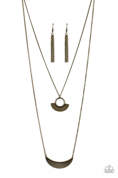 Radiating with linear patterns, a flared brass frame swings above a brass half-moon frame, creating tribal inspired layers below the collar. Features an adjustable clasp closure.