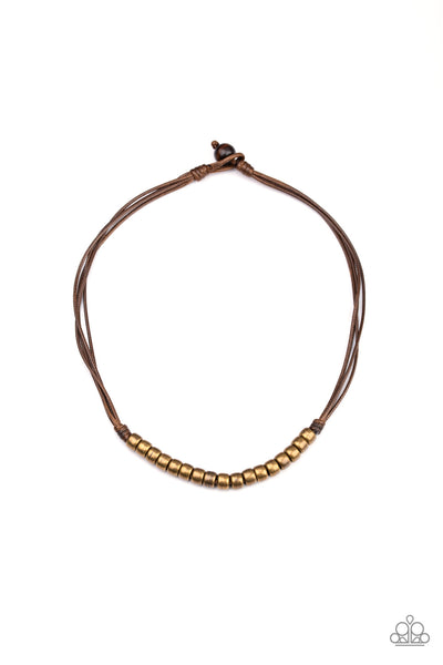 A row of brass beads is knotted in place along strands of brown cording below the collar for a seasonal look. Features a button loop closure.