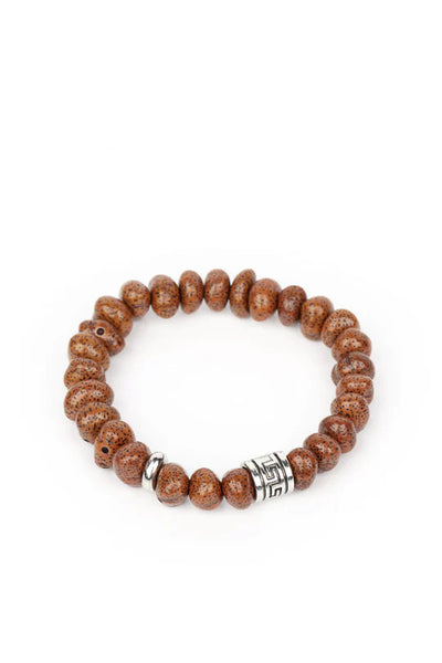Featuring a natural finish, a collection of faux brown stones are threaded along a stretchy band around the wrist. Shimmery silver accents are added to the earthy compilation for an artisan inspired finish.