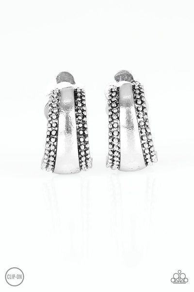 Flanked in studded rows, a shiny silver frame curls around the ear for a classic look. Earring attaches to a standard clip-on fitting.