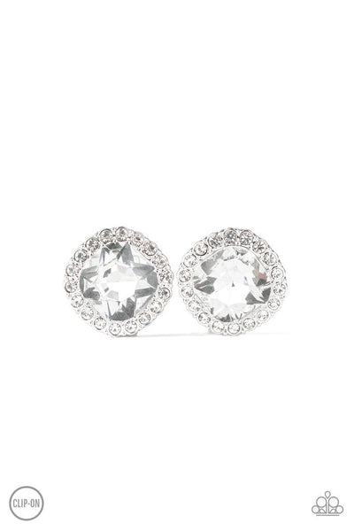 A border of glassy white rhinestones spin around a dazzling white rhinestone, creating a glamorous frame. Earring attaches to a standard clip-on earring.