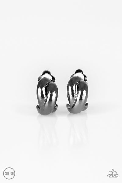 Glistening black bars crisscross into an elegant frame. Earring attaches to a standard clip-on fitting.