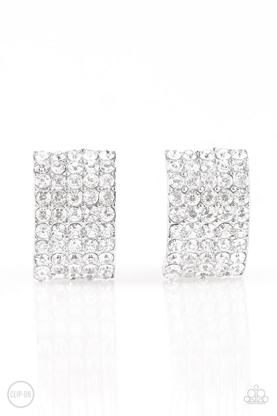 Encrusted in row after row of glassy white rhinestones, a radiant silver ribbon curls around the ear for a glamorous look. Earring attaches to a standard clip-on fitting.
