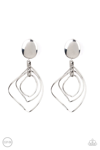 A twirling trio of glistening silver leaf shaped frames are threaded through a flat silver rod at the bottom of a glistening silver oval frame, creating an abstract lure. Earring attaches to a standard clip-on fitting.
