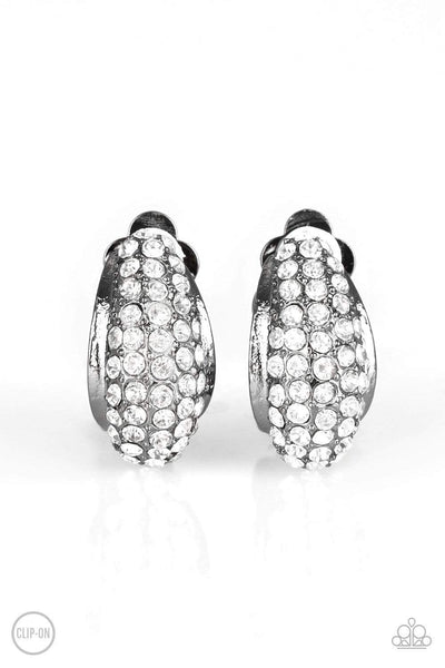 A glistening gunmetal frame is encrusted in row after row of glassy white rhinestones for a timeless look. Earring attaches to a standard clip-on fitting.