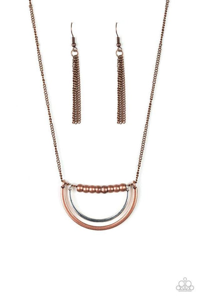 A strand of shiny copper beads give way to bowing silver and copper frames, creating an edgy pendant below the collar. Features an adjustable clasp closure.