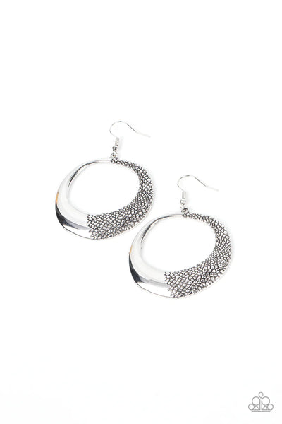 One side of an asymmetrical silver hoop is embossed in rugged pebble like texture, culminating in a wildly abstract frame. Earring attaches to a standard fishhook fitting.