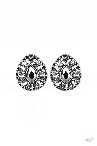 A silver teardrop frame is encrusted in glittery hematite rhinestones, creating a sparkling floral frame. Earring attaches to a standard post fitting.