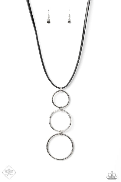 Gradually increasing in size, two hematite rhinestone encrusted hoops link with a smooth silver hoop down the chest. The airy stacked pendant slides along a black leather cord for a fierce and edgy finish. Features an adjustable clasp closure.