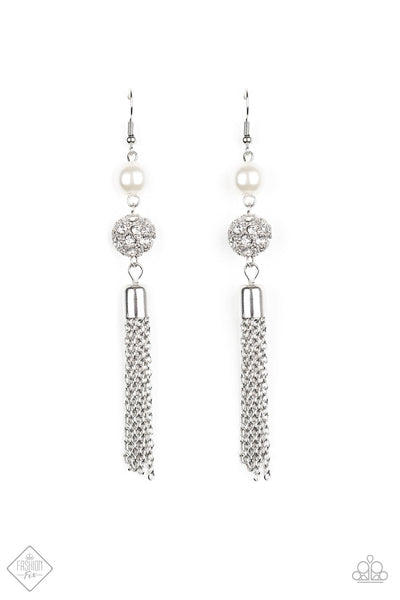 A solitaire white pearl gives way to a glittery white rhinestone-encrusted silver bead. A shimmery silver tassel cascades from the bottom of the stacked elegance for a flirty finish. Earring attaches to a standard fishhook fitting.