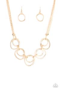 Infused with decorative gold links, an asymmetrical assortment of gold rings delicately link below the collar for a refined flair. Features an adjustable clasp closure.