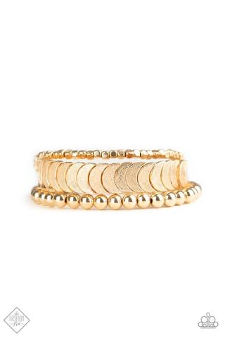 Featuring rounded, cubed, and half-moon shapes, dainty gold beads are threaded along three different stretchy bands, creating trendy metallic layers around the wrist.