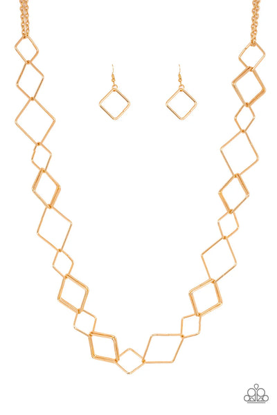 Varying in size, airy gold square silhouettes link across the chest for an edgy look. Features an adjustable clasp closure.
