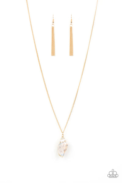 Bordered in a glistening gold finish, an iridescent seashell swings from the bottom of a lengthened gold chain for a summery flair. Features an adjustable clasp closure.