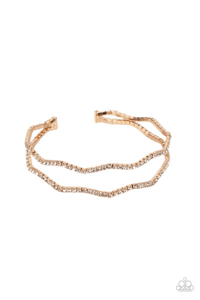 Wavy rows of glittery white rhinestones delicately connect into a dainty gold cuff around the wrist, creating a timeless centerpiece.