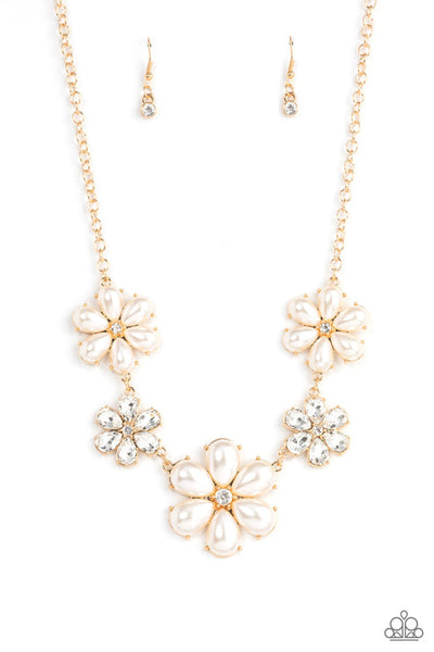 Featuring glassy white rhinestone centers, bubbly pearl petaled gold flowers gradually increase in size as they alternate with white rhinestone petaled flowers below the collar for a fierce floral fashion. Features an adjustable clasp closure.