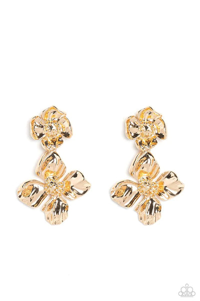 Featuring a warped metallic texture, an oversized gold flower hangs from a smaller gold flower for a whimsical finish. Dainty gold studs coalesce the centers of each flower, adding tactile detail to the floral design. Earring attaches to a standard post fitting.
