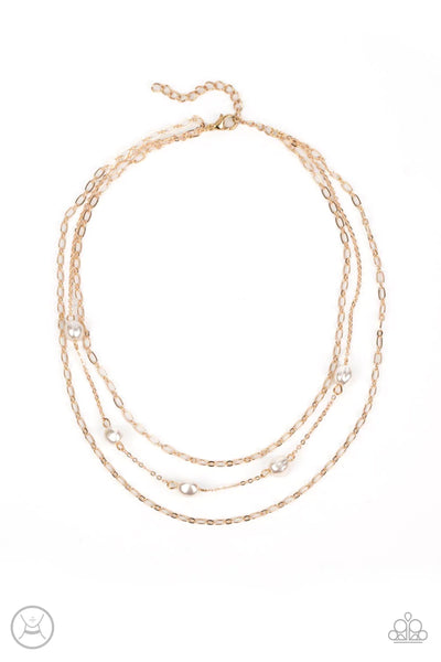 Infused with two oval-linked gold chains, imperfect white pearls adorn a dainty gold chain around the neck for a summery layered look. Features an adjustable clasp closure.