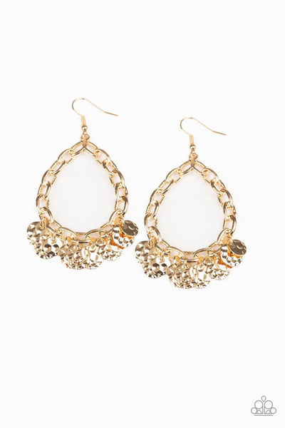 Hammered gold discs dangle from the bottom of a gold chain link teardrop, creating an edgy fringe. Earring attaches to a standard fishhook fitting.