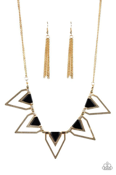 Infused with shiny black beading, glistening gold triangular frames join below the collar, creating a fierce geometric fringe. Features an adjustable clasp closure.