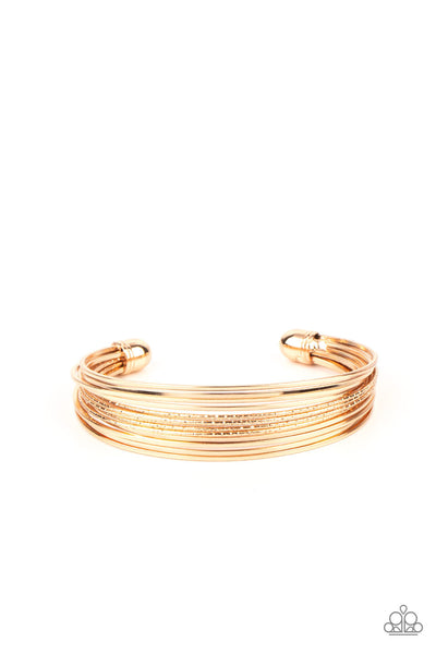 Capped in gold fittings, rows of smooth gold wires flank a section of diamond cut gold wire around the wrist, creating an edgy cuff.