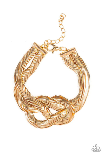 Two thick rows of gold herringbone chain knot into a bold centerpiece atop the wrist. Features an adjustable clasp closure.