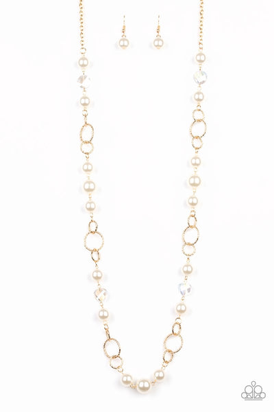A refined collection of glassy white gems, textured gold rings, and pearly white beads drape across the chest for a timeless look. Features an adjustable clasp closure.