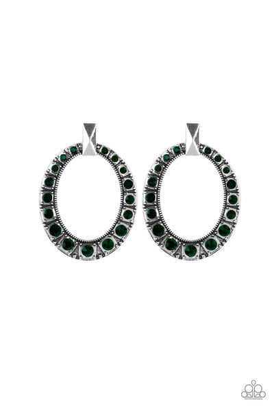 Featuring a faceted silver fitting, a beveled silver hoop is encrusted in glittery green rhinestones that gradually increase near the bottom of the ornate frame for an edgy finish. Earring attaches to a standard post fitting.