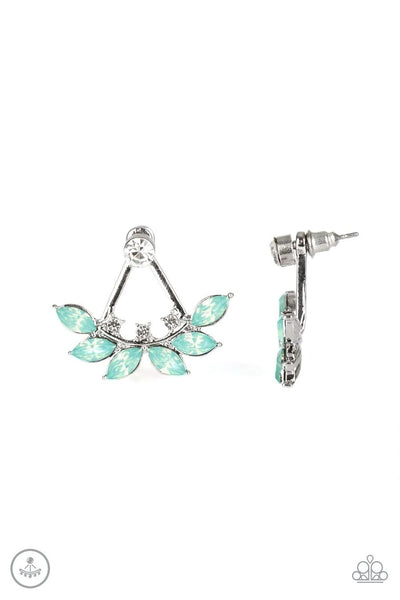 A solitaire white rhinestone attaches to a double-sided post, designed to fasten behind the ear. Encrusted in dainty white rhinestones and leafy green rhinestones, the angular double-sided post peeks out beneath the ear, creating a glittery foliage. Earring attaches to a standard post fitting.