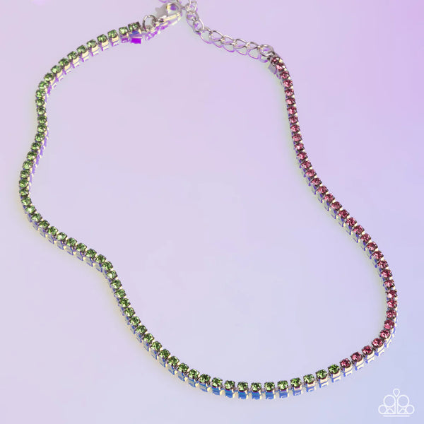 Set in sleek silver square fittings, rose rhinestones transition to green rhinestones along the collar for a dazzling, dichromatic display. Features an adjustable clasp closure.